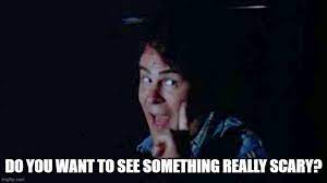 I always think of Ms. Williams this time of year because she loves (trying not to use the past tense too much here, because I am pretty sure she’s still alive!) scary movies. She had an entire unit on scary movies in our class, and would show us clips from her favorite horror films. We watched the Twilight Zone segment (I think it was from the Twilight Zone movie – starring Dan Aykroyd) where there was a monster on the wing of the airplane, and I still can’t take a flight without thinking about it. She used to turn out the lights in the classroom and hold a flashlight up to her face while she told us scary campfire stories. She told the story about the babysitter getting phone calls from the murderer inside the house, and a story about an old woman putting a puzzle together, and slowly learning that the picture in the puzzle shows her in her house putting together a puzzle – and the last piece reveals that there’s a man with a knife standing behind her. EEK! She once told me that in order to really watch a scary movie correctly, you should turn all the lights out in the house and open all of the doors and windows for full effect. I’m more of a watch-in-broad-daylight-with-a-friend-with-all-lights-on-and-doors-locked-and-SimpliSafe-armed kind of scary movie connoisseur, but I can understand where she’s coming from with this suggestion. In addition to all the other great things I learned in Ms. Williams’ class, I also learned that it’s really fun to be scared!