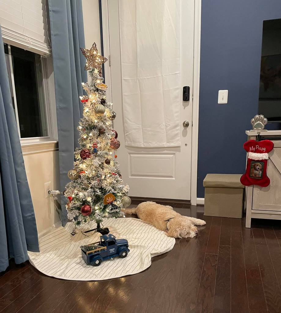 I put my Christmas tree up last weekend. Something about covid has compelled me to put it up early over the last couple of years. It’s only about 4 feet tall, and takes less than ten minutes to decorate with my puny collection of ornaments with two main themes: 1) Kentucky and 2) Harry Potter. I have my little Maudie ornament that my mom bought me and the Swiss Cake Roll ornament that Santa left in my stocking at my sister’s house last year, and a Mario ornament I bought at Target. And that’s about it. I hung Maudie’s stocking by the tv with little care, and plugged in my Spiced Apple Toddy wallflower plug-in from Bath and Body Works and TA-DA, it’s Christmas.